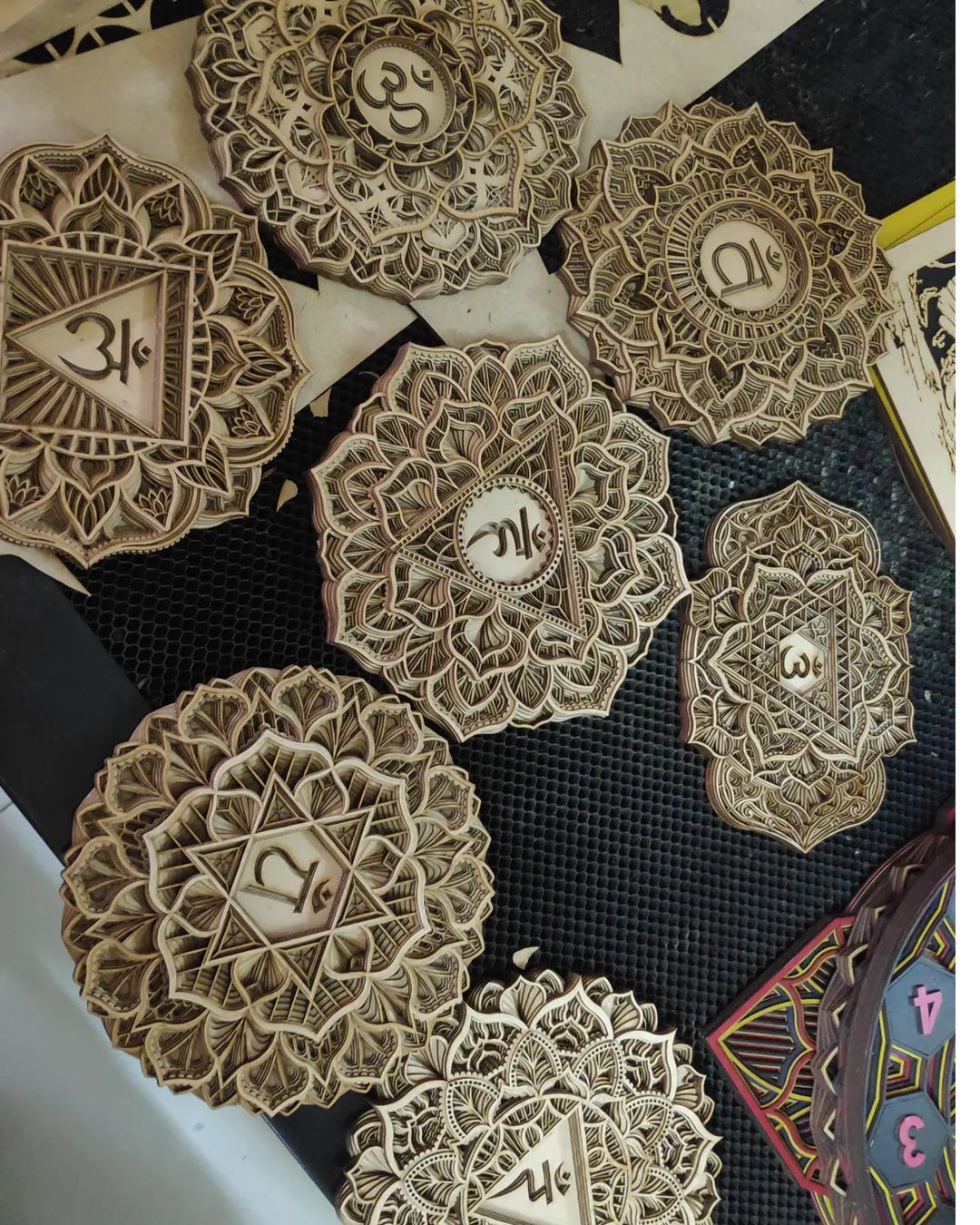 A multi-layer design consisting of layer by layer stack of MDF materials. Customers will provide with pre-marked numbers on each layer. So they can stack it layers easily. The size is 12 inch for individual seven chakras with 2 mm thickness of each layer. Each Chakras contain 8 individual layers.